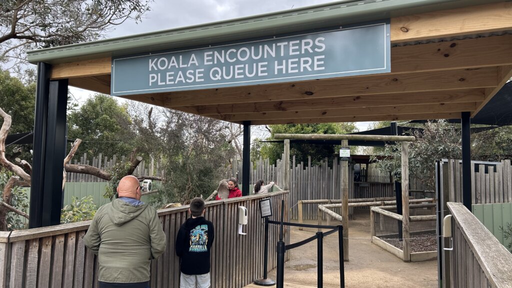 以前常看到別人分享抱無尾熊的體驗,非常有興趣。這次出發前研究一番發現我們要去州是法律禁止抱無尾熊的,據說是為了保障牠們生活品質,避免上班太累(?)。最接近的選項就是所謂的 Koala Encounter,也就是讓你摸摸牠。雖然有點遺憾,但『來都來了』,還是想摸摸看~